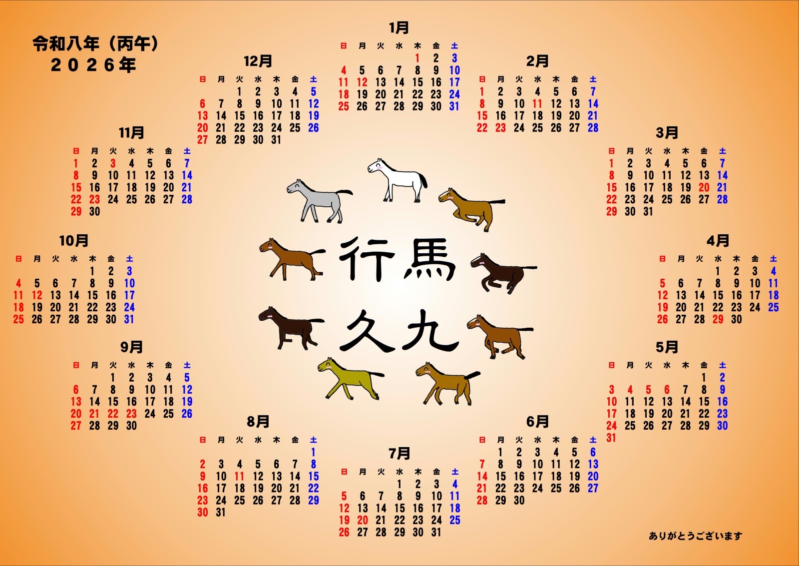 発売中・送料無料【プレゼントシールとハガキ付き】2026年くれいん舎オリジナルカレンダー(A4サイズ) [干支【うま】橙色(背景)バージョン]